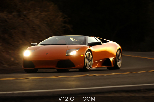 Accueil V12 GT / Les plus belles photos de GT et de Classic. / Photos GT / Lamborghini / Lamborghini Murcielago LP640 Roadster orange 3/4 avant gauche filé 2